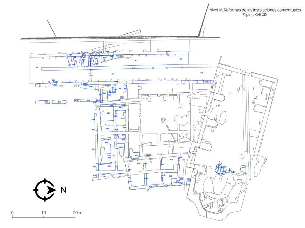 - Nivel III. Construcción del convento dominico a comienzos del siglo XVI. Instalaciones conventuales canónicas de una orden mendicante: iglesia, necrópolis interior, portería, claustro, sala capitular, refectorio, torre, cilla y bodega.