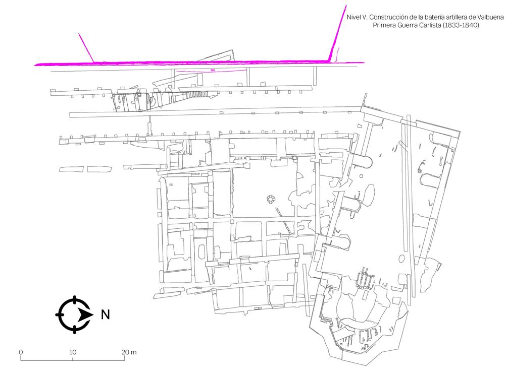 - Nivel V. Construcción del recinto fortificado de la ciudad en el contexto de la Primera Guerra Carlista (1833-1840). El recinto del antiguo convento se rodea de una batería artillera.
